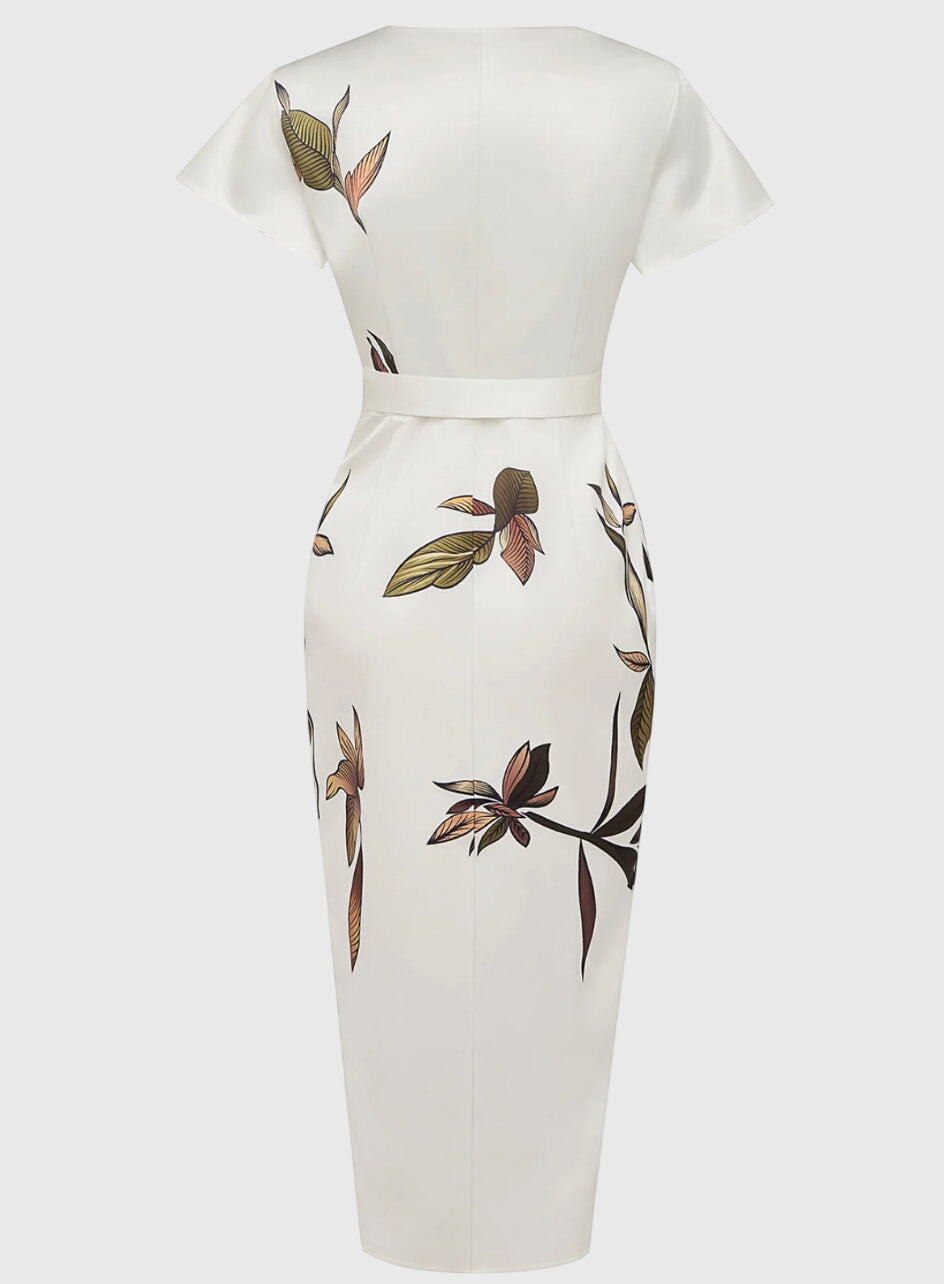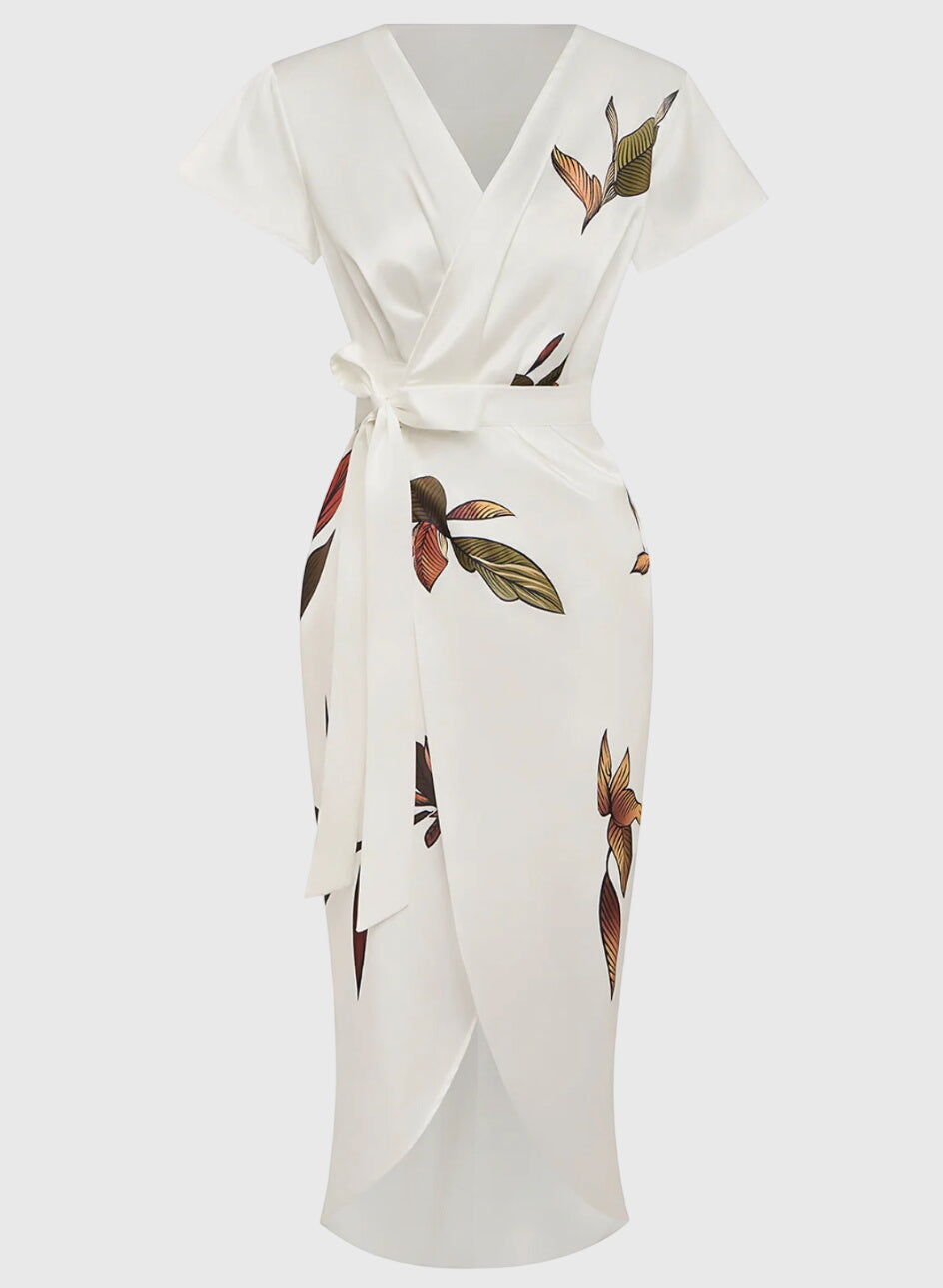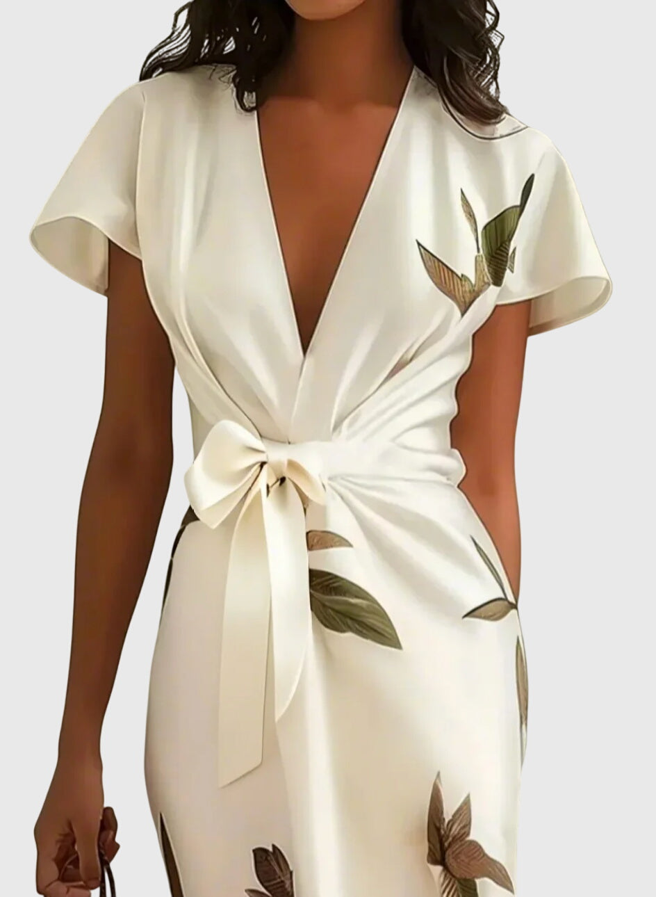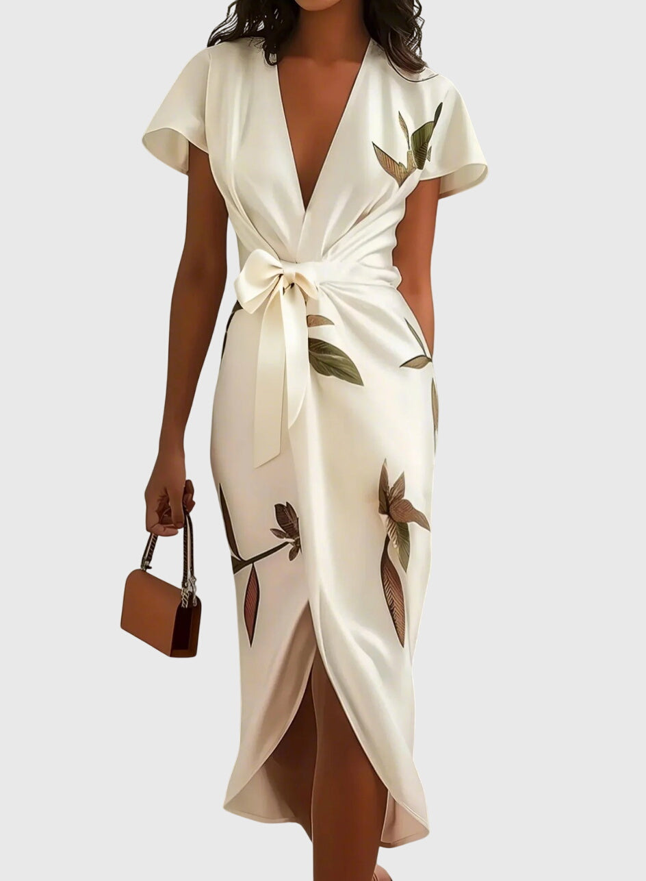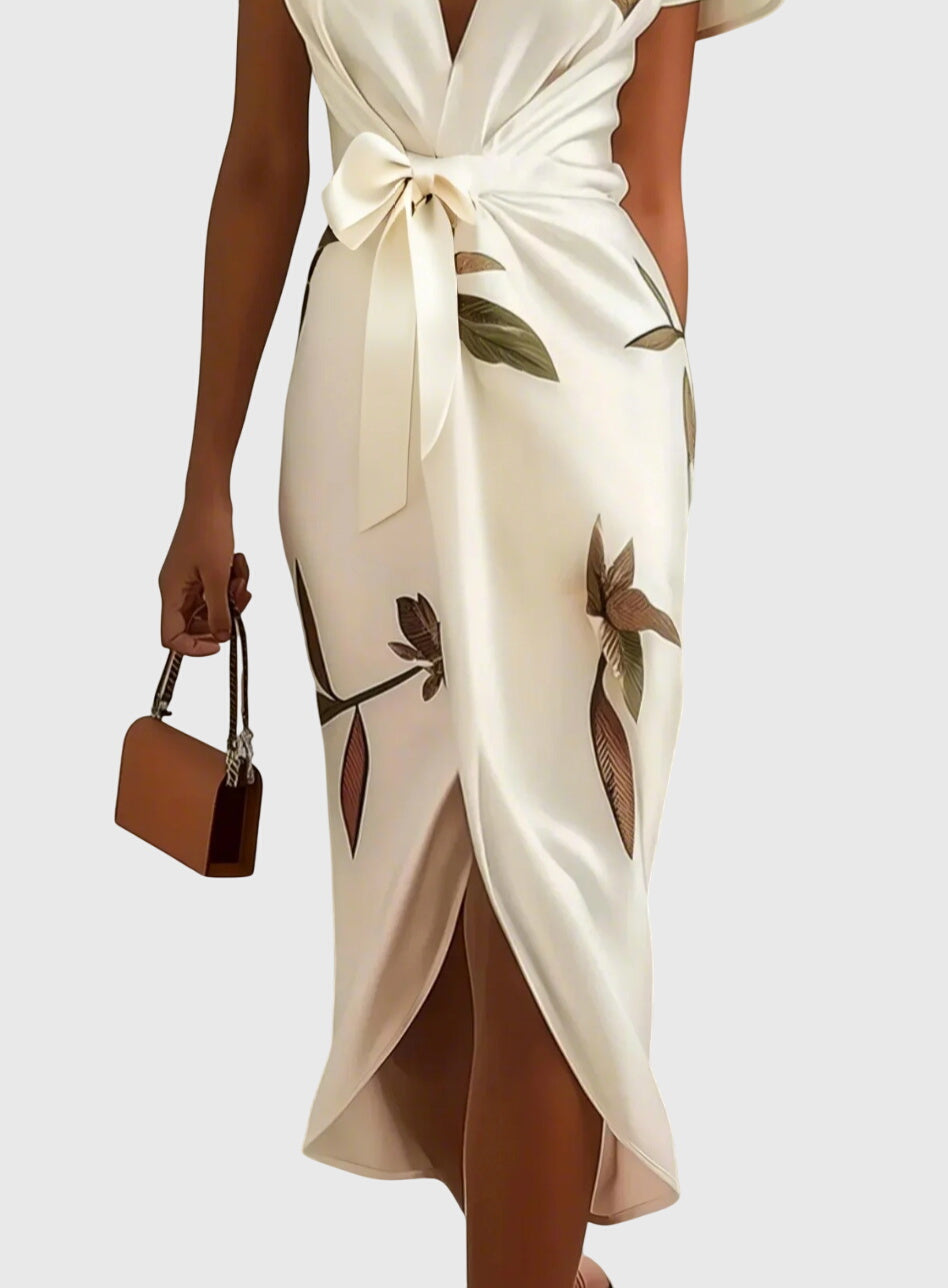 השמלה האלגנטית שלנו NOMI - שמלת סטן לבנה היא הפתרון המושלם לרגעים בלתי נשכחים. היא עוצבה כדי להדגיש את הדמות שלך ומוסיפה נופך רומנטי עם קשר עדין במותן. הדפס העלים המעודן מוסיף נופך טבעי ומעודן, בעוד שצווארון ה-V העמוק והחצאית המגולגלת עם חריץ צדדי יוצרים את האיזון המושלם בין אלגנטיות למשיכה.